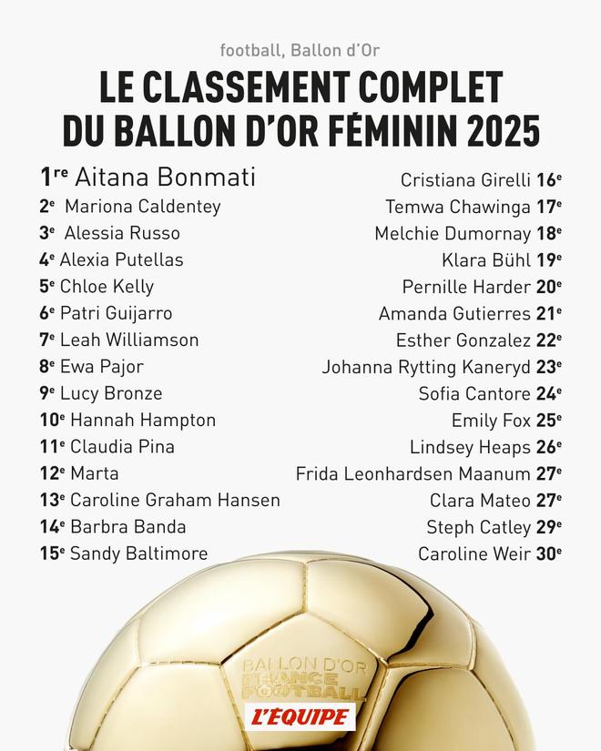 2025女足金球奖排名:邦马蒂三连庄,阿森纳两将获二、三