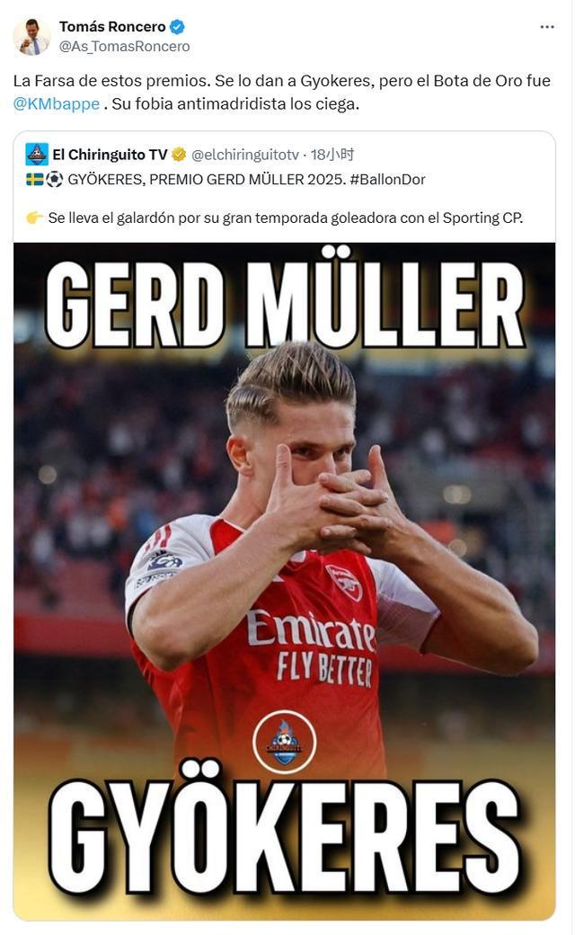 龙赛罗在自己的一条社媒中写道:“这些奖项简直是闹剧。他们把这项奖(盖德-穆勒奖)颁给了约克雷斯,(欧洲)金靴奖却颁给了姆巴佩。他们的反皇马恐惧症蒙蔽了他们的双眼。”