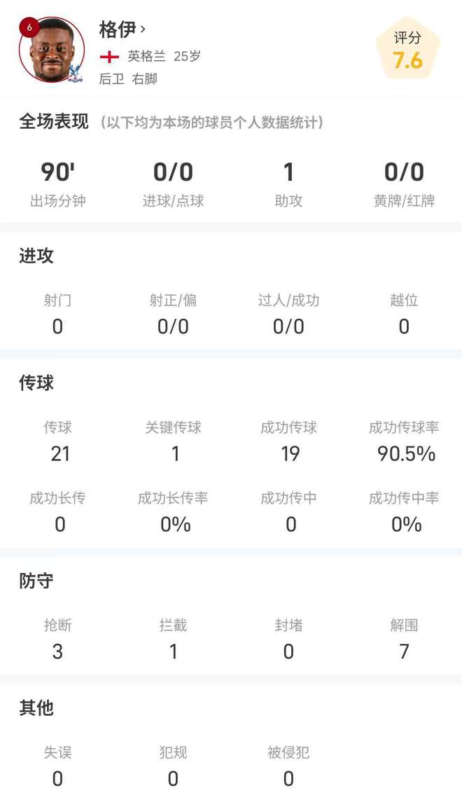 雷速体育9月28日讯 英超第6轮,水晶宫主场2-1爆冷绝杀利物浦,水晶宫后卫格伊首发出战并在随后时刻助攻恩凯蒂亚绝杀对手。