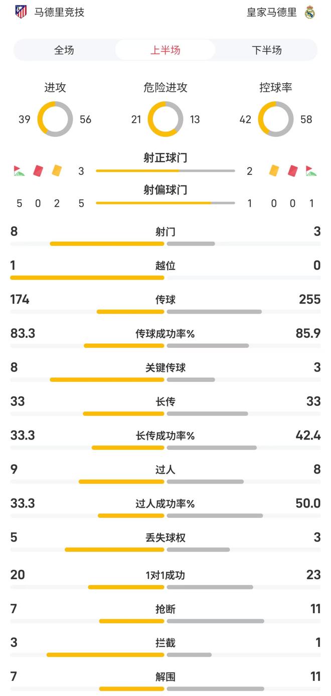 马竞vs皇马半场数据:射门8比3,控球率42%比58%