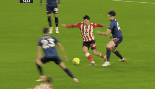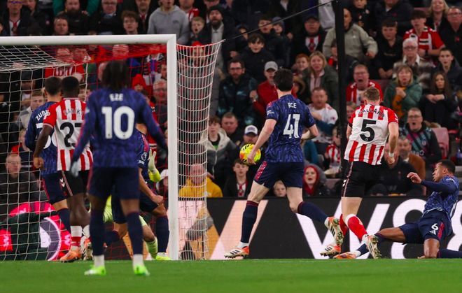 上半场补时阶段,卡拉菲奥里传中,萨卡力压后卫头球摆渡,萨利巴展现后卫脚法,错失良机。